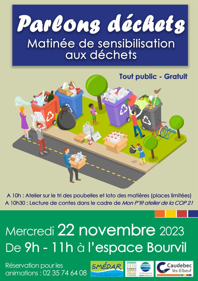 Mercredi 22 novembre 2023 de 9h à 11h à l’espace Bourvil, dans le cadre de la Semaine Européenne de la Réduction des Déchets, la Ville propose une matinée de sensibilisation aux déchets.